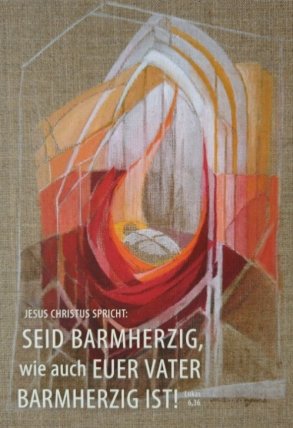 Die Künstlerin Stefanie Bahlinger hat zur Jahreslosung diese Grafik geschaffen. In der Mitte liegt ein kleines, von warmem Rot umgebenes Kind, geborgen wie im Mutterleib. In diesem Kind kommt Gott selbst zu Welt, kommt in die Niederungen seiner geliebten Schöpfung, angedeutet durch einen Ausschnitt des Erdenrunds dahinter. Genau dieses Motiv des heruntergekommenen Gottes wählt die Künstlerin zur Illustration göttlicher „Ureigenschaft“, der Barmherzigkeit. In Jesus wird sie anschaulich und greifbar – und macht sich angreifbar. Das goldgelb umstrahlte Kind ist schon mit dem Kreuz gezeichnet.