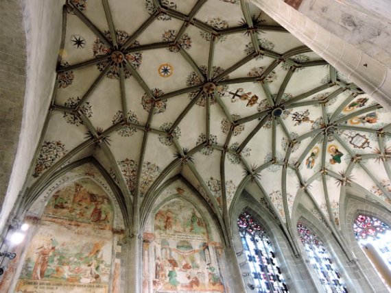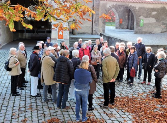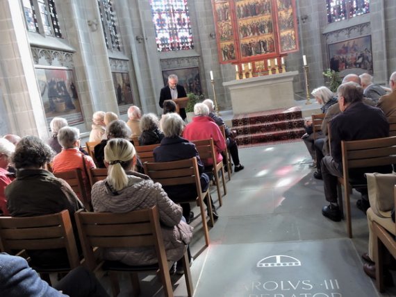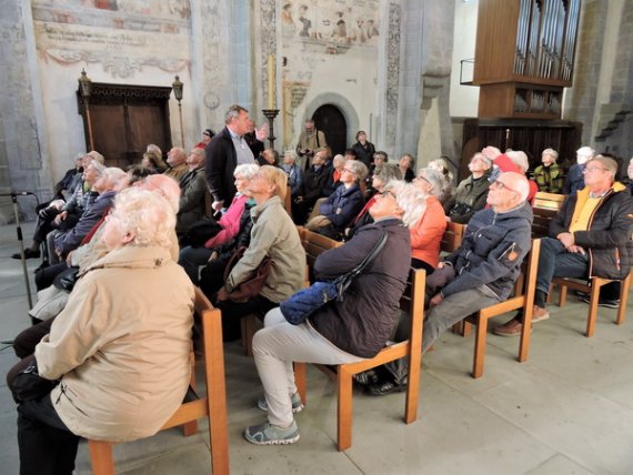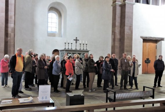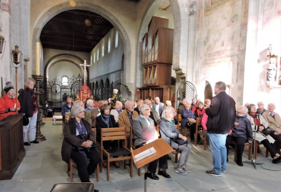 Als letztes sakrales Highlight stand die Kirche St. Peter und Paul auf dem Programm. Der Gedanke an das Mittagessen, der sich schon bei manch hungrigem Teilnehmer störend in die Kunstbetrachtung mischte, musste daher aufgeschoben werden. Hier fiel vor allem der krasse stilistische Gegensatz zwischen ruhiger Romanik in der Apsis und verspieltem Rokoko im Hauptschiff auf.