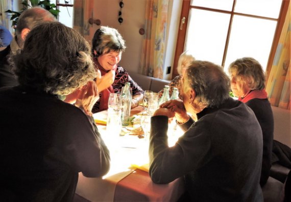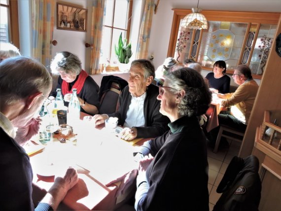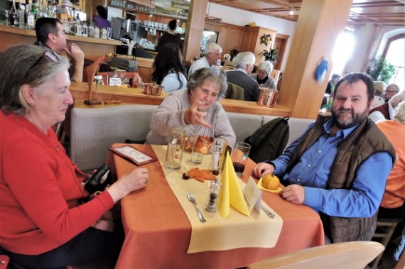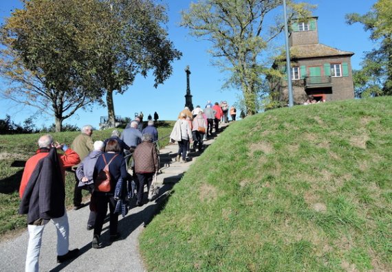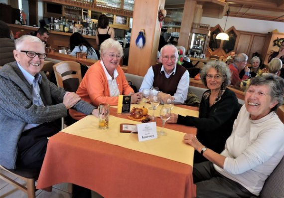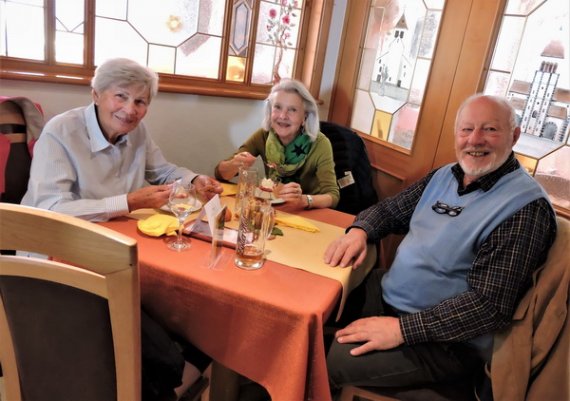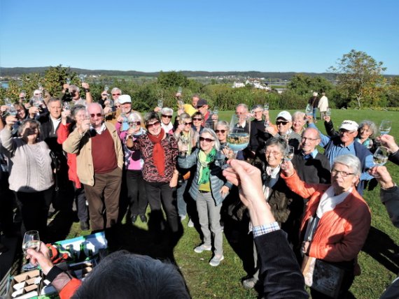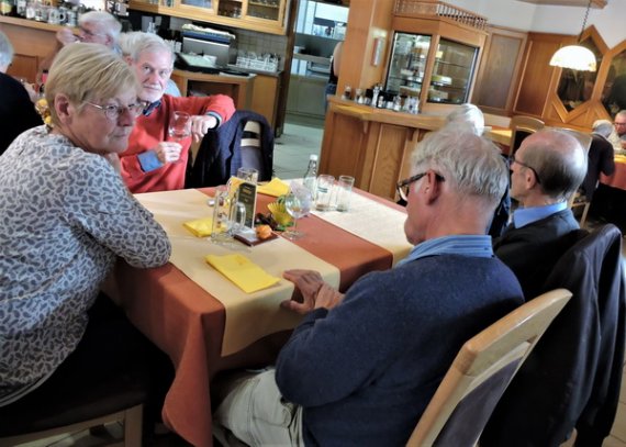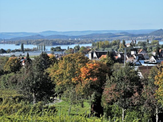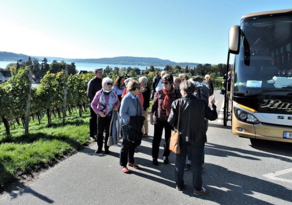 Im Restaurant „Zum alten Mesmer“ wurden wir bereits erwartet und mit größter Freundlichkeit bedient. Gut erholt stiegen wir wieder in den Bus, von dem aus unsere Führerin Interessantes aus dem Wirtschaftsleben der Insel erzählte. Als Höhepunkt des Nachmittags brachte sie uns auf den „Gipfel“ der Insel – ganze 40 Meter über dem See – von dem aus sich eine unerwartete Fernsicht öffnete: Von den Vulkanhügeln im Hegau über den Untersee bis zum Konstanzer Münster reichte der Blick. Als Überraschung präsentierte sich die Reiseführerin als Gastgeberin und kredenzte selbst angebauten Wein, der, an diesem einmaligen Ort getrunken, einen genussvollen Ausklang dieser Kulturfahrt bescherte.