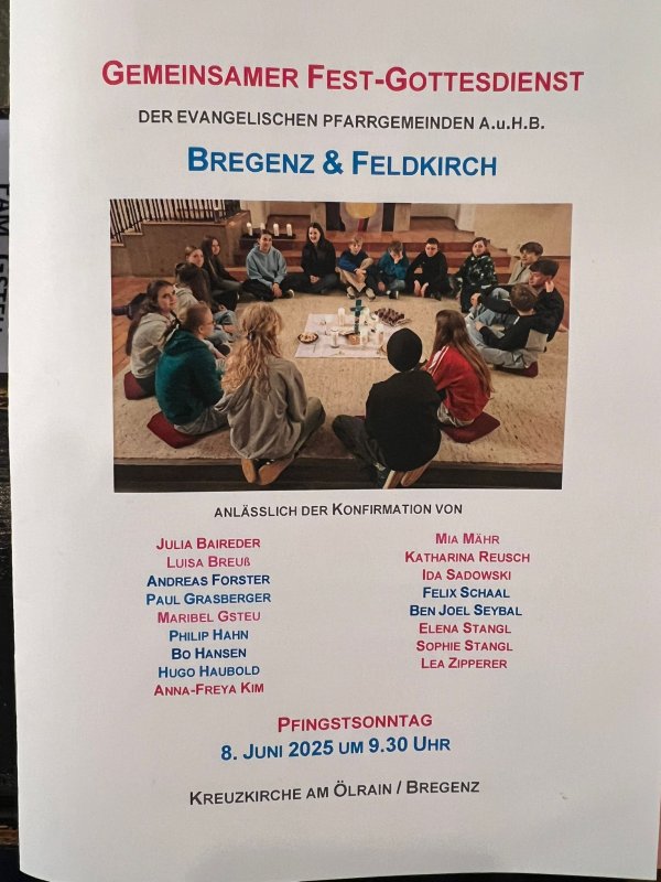 Am Pfingstsonntag, 8. Juni feierten wir in der Kreuzkirche am Ölrain die Konfirmation von 17 Jugendlichen aus Bregenz und Feldkirch. In einem festlichen Gottesdienst wurden sie gesegnet und für ihren weiteren Lebensweg ermutigt.