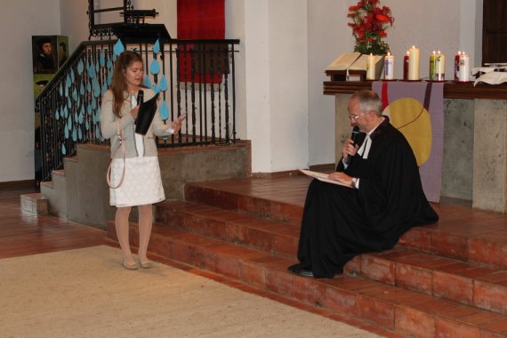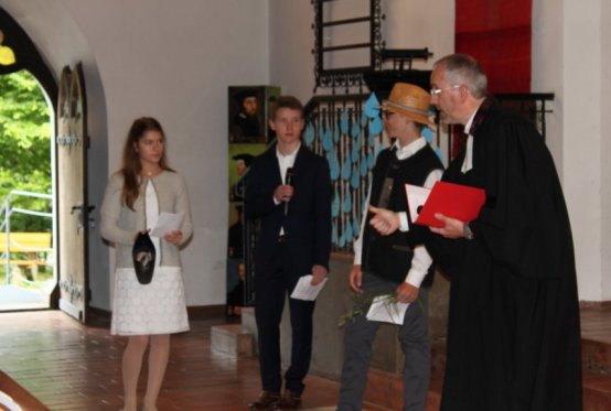 Höhepunkt war u.a. die Mitwirkung der Konfirmand_innen im Gottesdienst: Malin (gemeinsam mit Lilli) und Felix (mit Maximilian Germ und Jonathan Salzmann) gestalteten musikalisch mit, Emma, Lara und Glenn übernahmen die Schriftlesung (Begegnung der samaritischen Frau mit Jesus am Jakobsbrunnen) und Florian, Madlen, Niklas und Felix übernahmen gemeinsam mit Pfarrer Stoffers die Predigt, in der es in drei Szenen - Gärtnerin, Aquarium und Landwirtschaft - um die allgemeine Bedeutung des Wassers für unser alltägliches Leben und die Übertragung auf unseren Glauben ging.