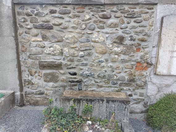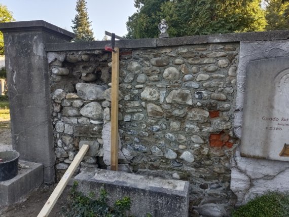 Bei den Friedhofsmauern löst sich stellenweise der Verputz und die darunterliegenden Mauersteine sind lose. Um zu sehen, ob und in welcher Form derartige Mauerteile saniert werden können, haben wir einen durch Risse stark betroffenen etwa 2 Meter langen Teil der Mauer vom vorhandenen Verputz befreit.