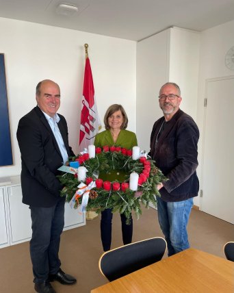 Am 24. November erfolgte die ökumenische Übergabe eines Original-Adventskranzes an Landesstatthalterin Dr. Barbara Schöbi-Fink durch Diakon Gerold Hinteregger (Seelsorgeraum Bregenz/Pfarre St. Gallus) und Pfr. Ralf Stoffers (Evang. Pfarrgemeinde A.u.H.B. Bregenz)